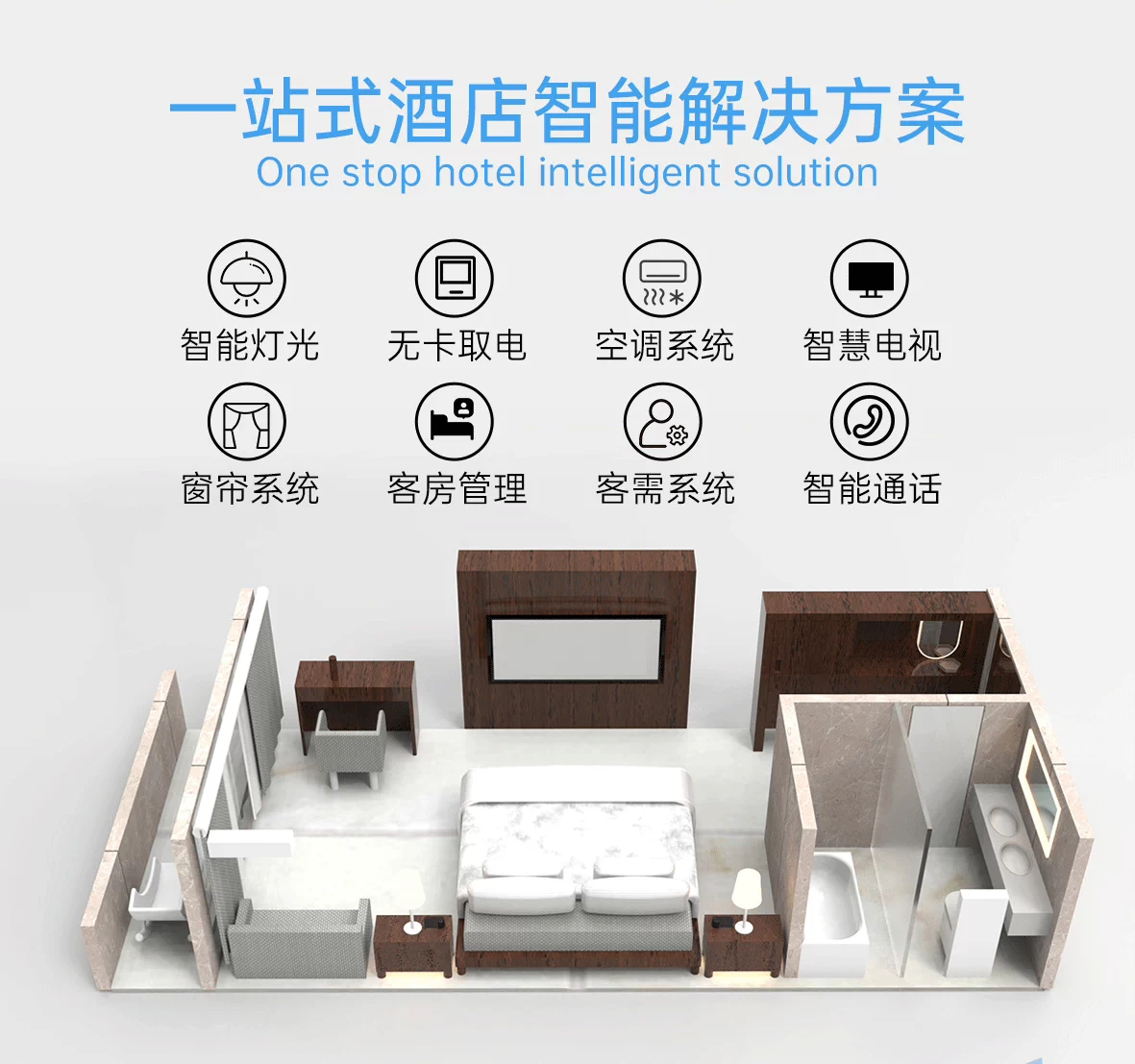 5.智慧語(yǔ)音控制系統(tǒng)功能:智能管家呼叫服務(wù)(打掃房間、開(kāi)發(fā)票、酒店介紹、訂餐等);智能語(yǔ)音控制還可以讓住客不用動(dòng)手即可操控整個(gè)房間的電視、空調(diào)、窗簾、照明系統(tǒng)等,除此之外還可以解決問(wèn)詢、通知前臺(tái)等客需服務(wù)。