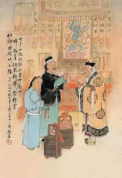 “拜織女”純是少女、少婦們的事。她們大都是預(yù)先和自己朋友或鄰里們約好五六人,多至十來(lái)人,聯(lián)合舉辦。舉行的儀式,是于月光下擺一張桌子,桌子上置茶、酒、水果、五子(桂圓、紅棗、榛子、花生,瓜子)等祭品;又有鮮花幾朵,束紅紙,插瓶子里,花前置一個(gè)小香爐。那么,約好參加拜織女的少婦、少女們,齋戒一天,沐浴停當(dāng),準(zhǔn)時(shí)都到主辦的家里來(lái),于案前焚香禮拜后,大家一起圍坐在桌前,一面吃花生,瓜子,一面朝著織女星座,默念自己的心事。如少女們希望長(zhǎng)得漂亮或嫁個(gè)如意郎、少婦們希望早生貴子等,都可以向織女星默禱。玩到半夜始散。